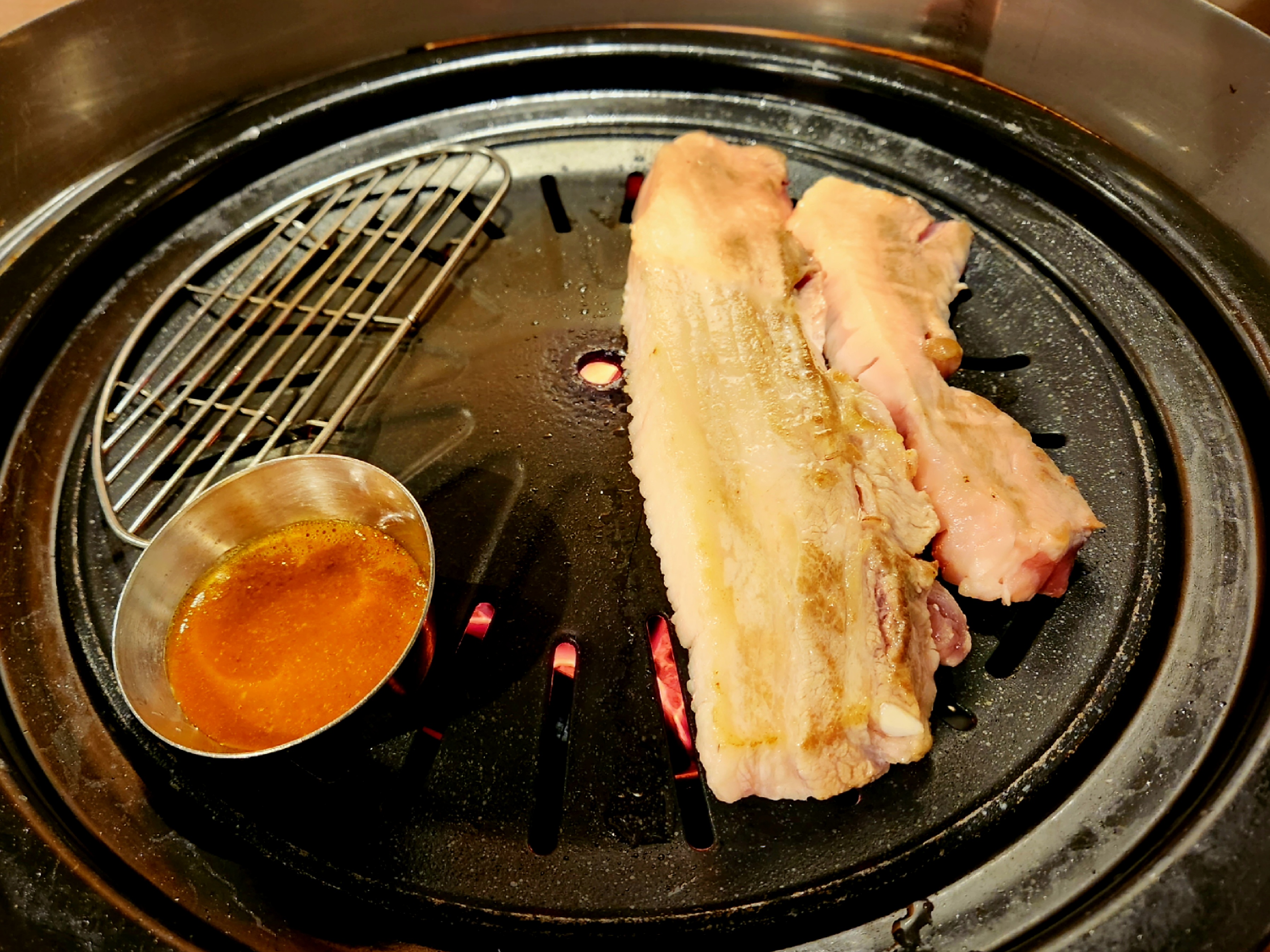 불판에 올라간 삼겹살~ 멜젓도 주시는데 옛날에는 비려서 안 좋아했는데 한번 맛 들이니 맛있어서 계속 먹게 되더라고요~