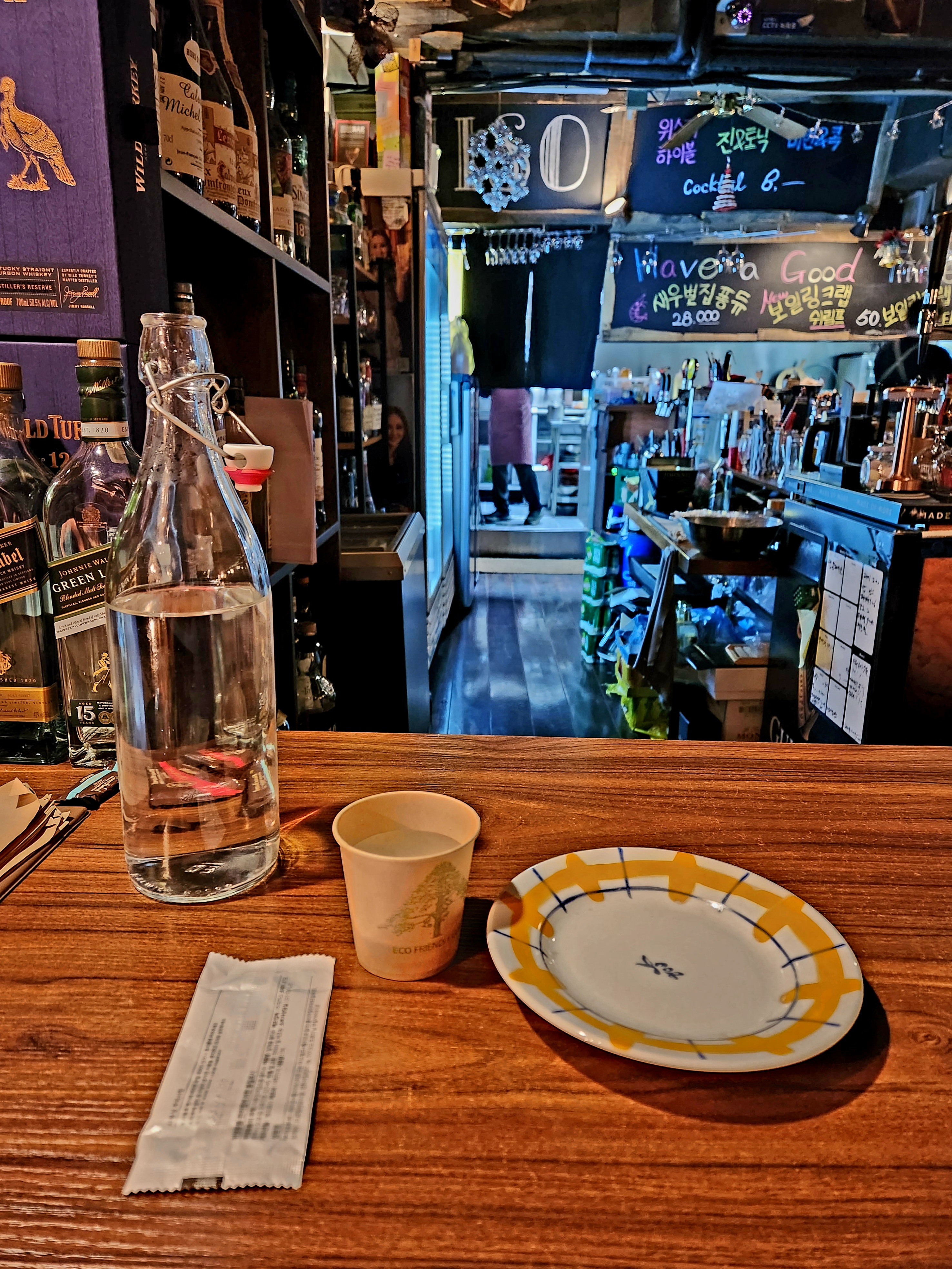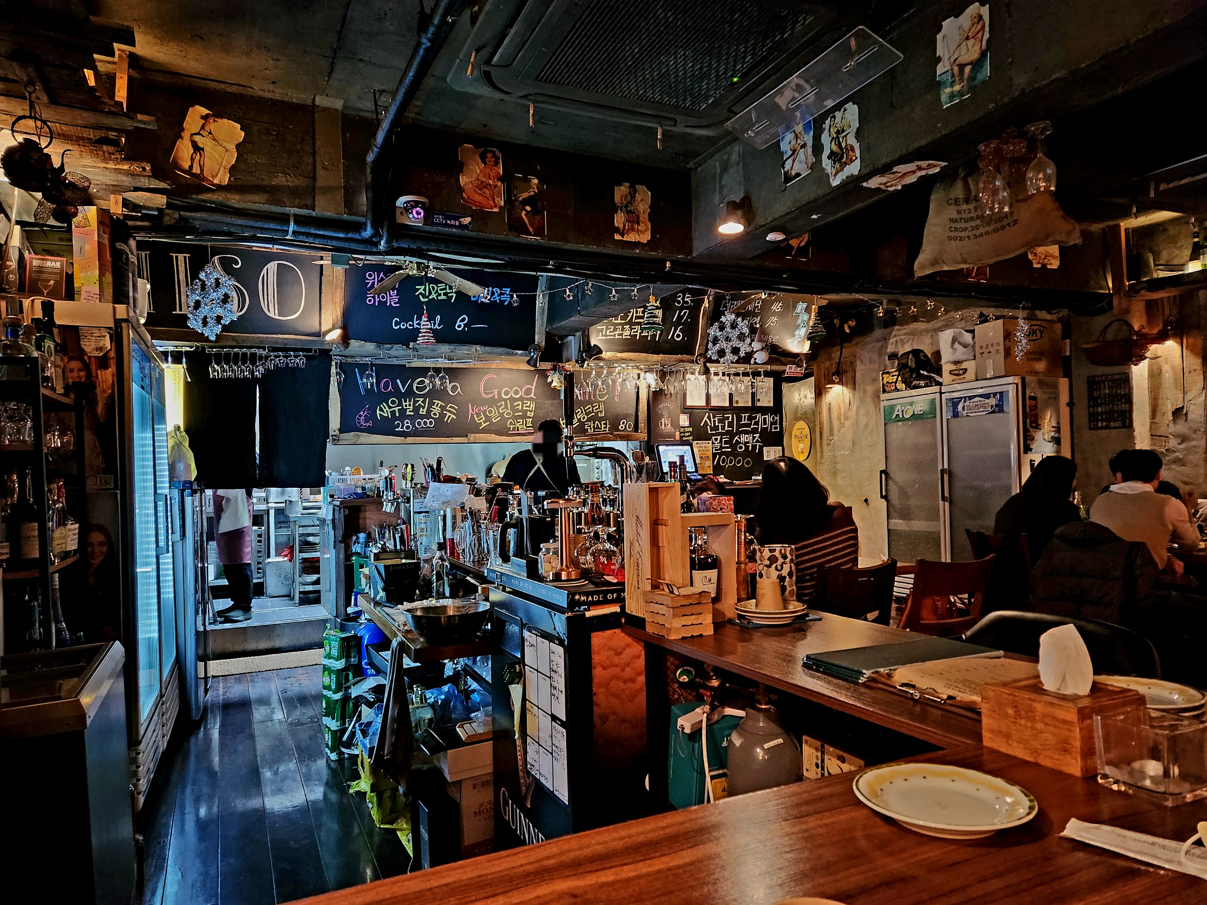 친구랑 저녁을 먹고 2차로 방문한 거라 자리가 없으면 어떡하나 했는데 테이블은 이미 만석이었고 바테이블만 남아있어서 친구와 저는 바테이블에 앉았습니다~
