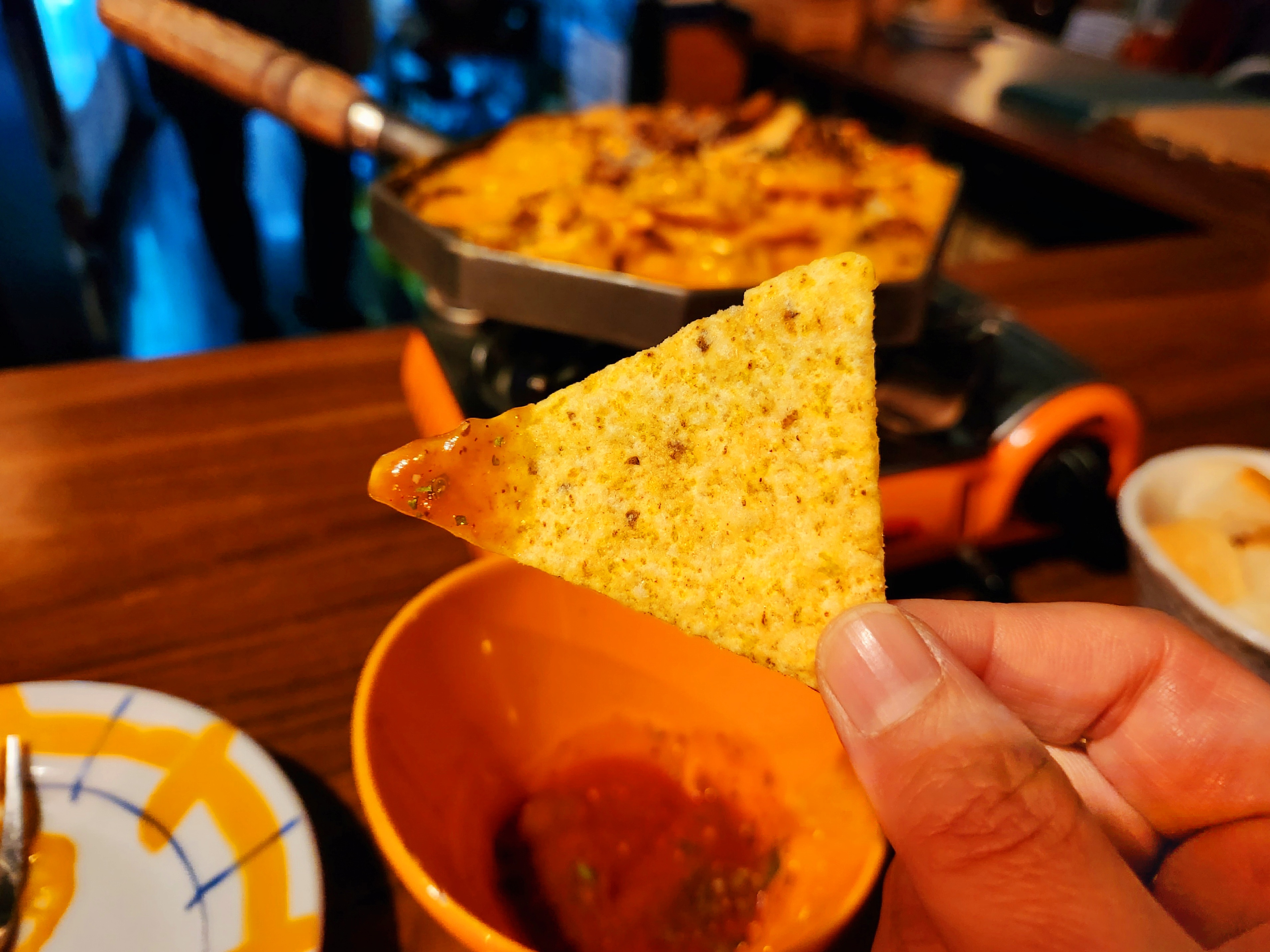 기본안주인 나쵸와 매콤하게 맛있었던 살사소스, 퐁듀에 찍어 먹을 빵을 세팅해 주셨습니다~
