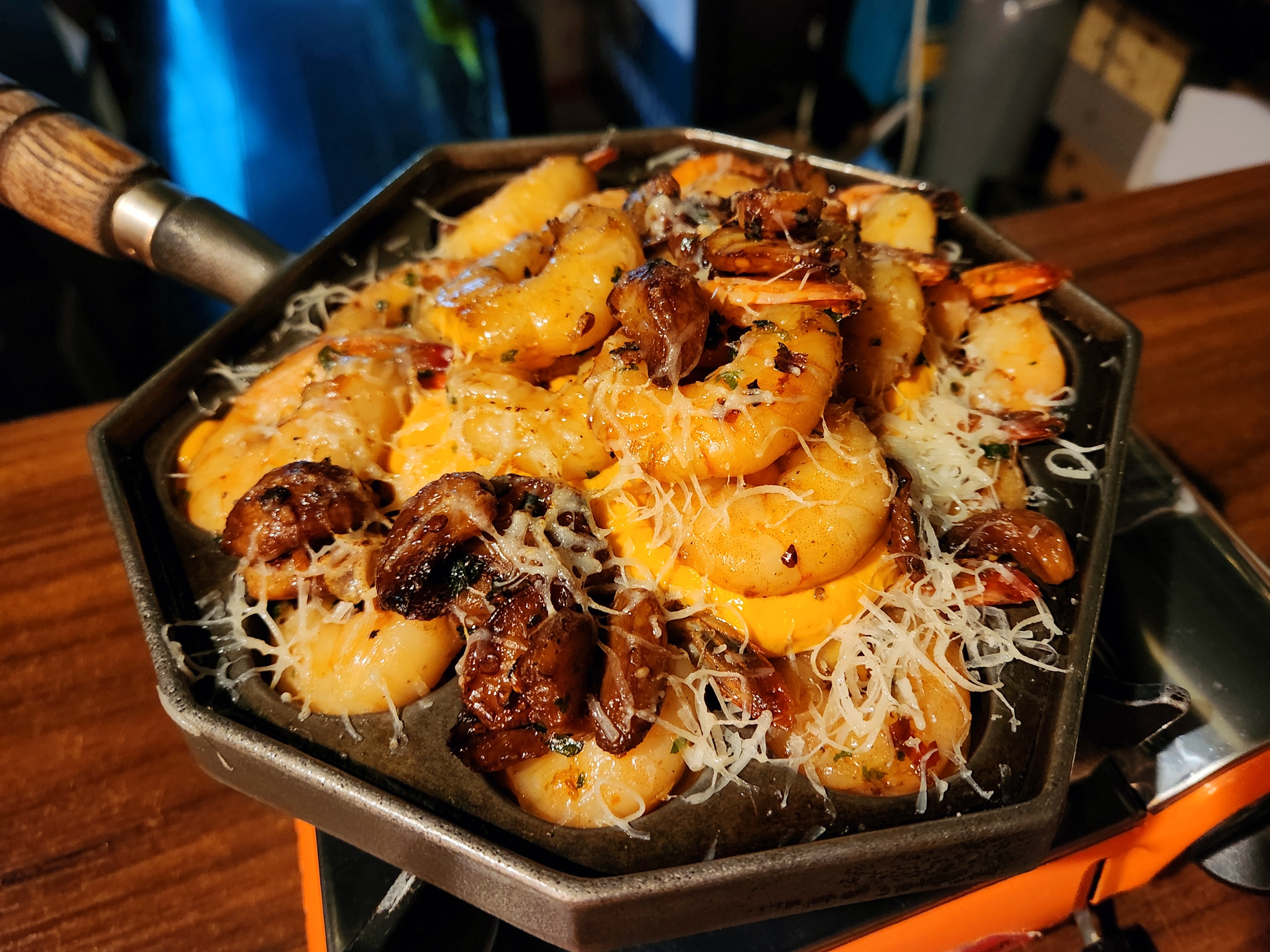 다코야끼팬에 통통한 새우와 튀긴 마늘과 치즈가 올라가 있더라고요~