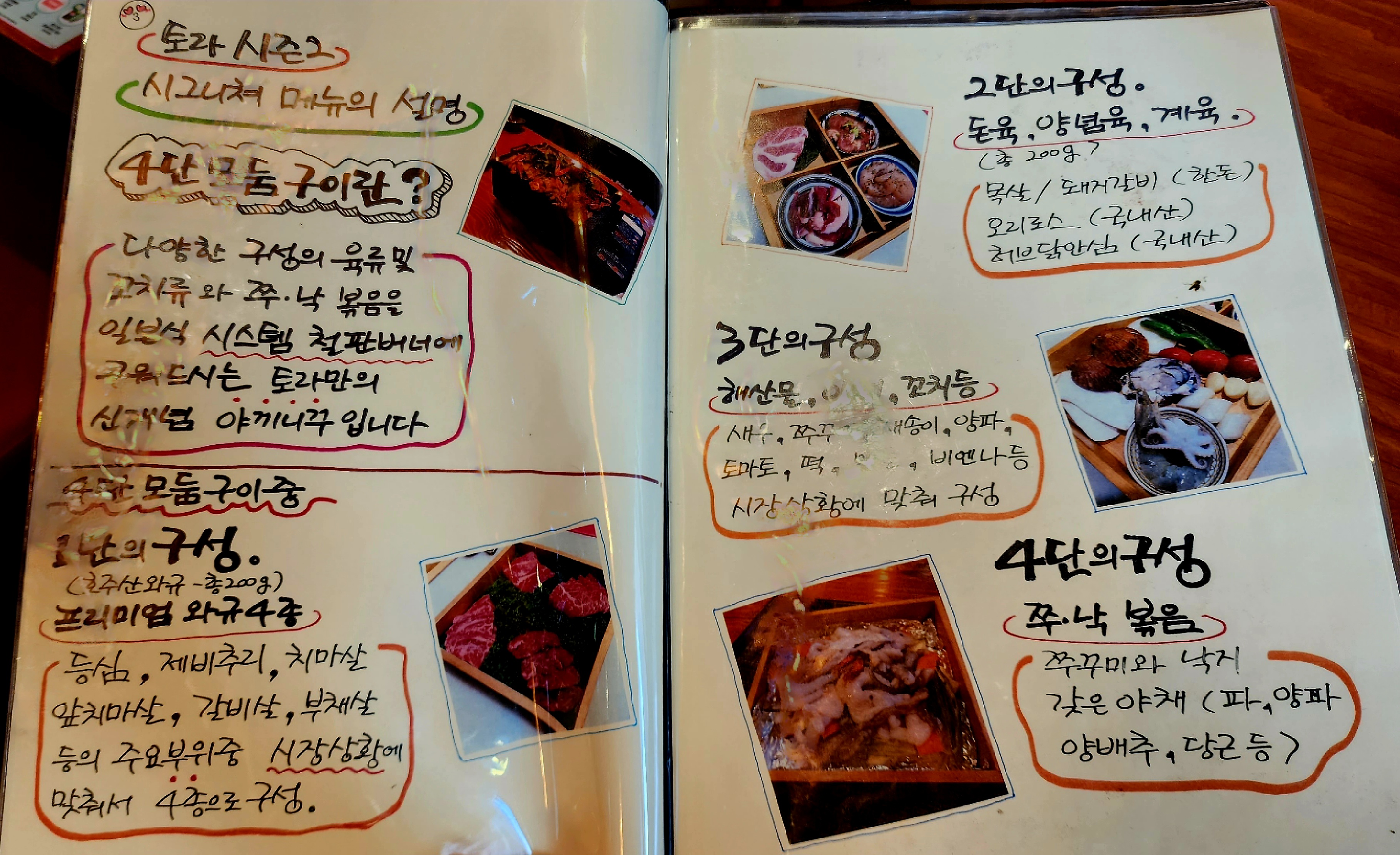서빙하시는 분께 어디 부위인지 여쭤보니 그분도 부위를 잘 모르셔서 메뉴판 참고했습니다~ 고기가 굉장히 신선해 보여서 마음에 들었습니다~ 👍