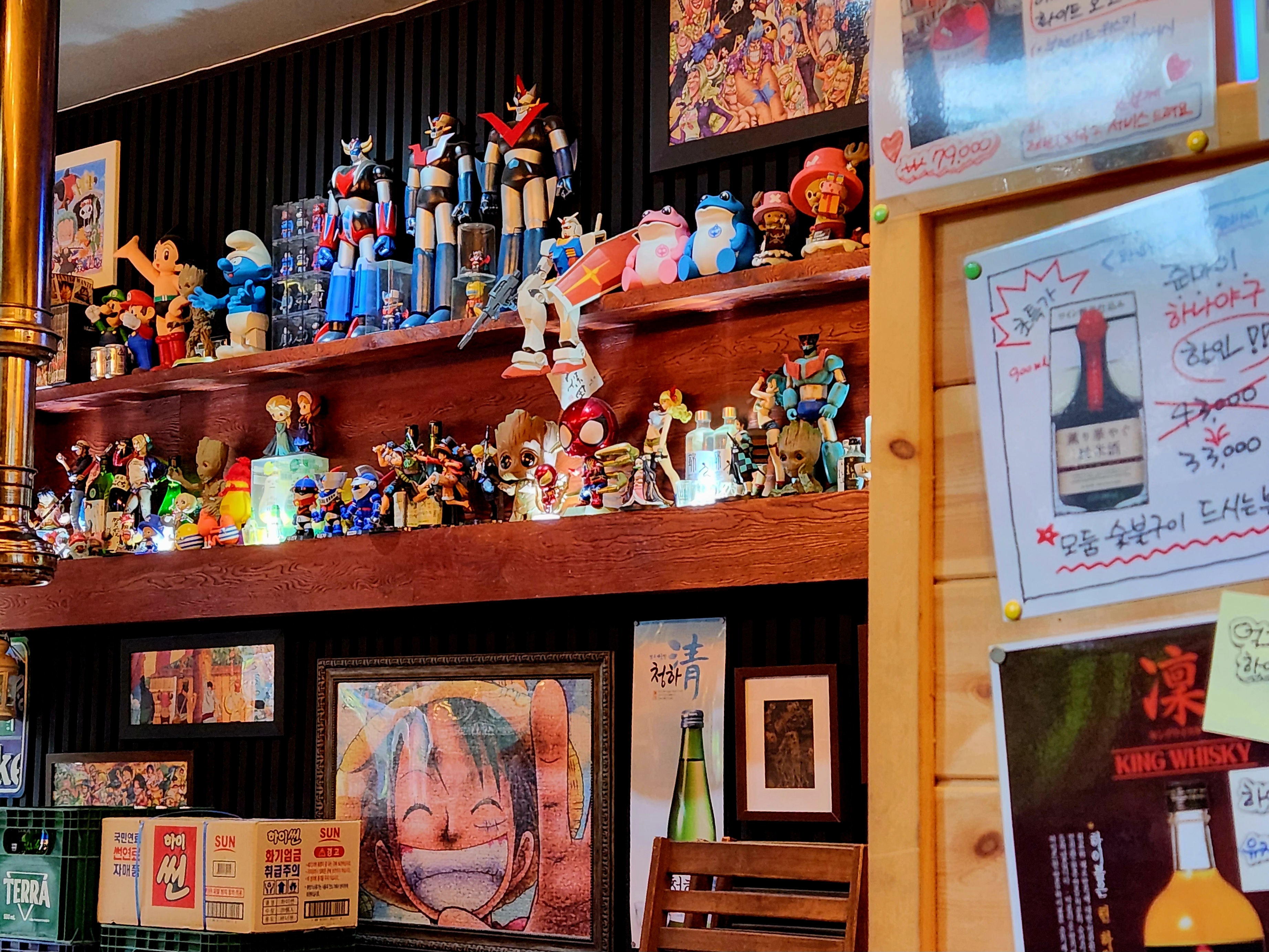 내부는 피규어들이 많아서 일본식 선술집, 이자카야 느낌이 많이 났습니다~ 평일 퇴근 후에 방문했는데 위치 때문인지 만석은 아니었지만 손님은 어느 정도 있어서 서빙하시는 분들이 굉장히 정신없어 보였습니다~